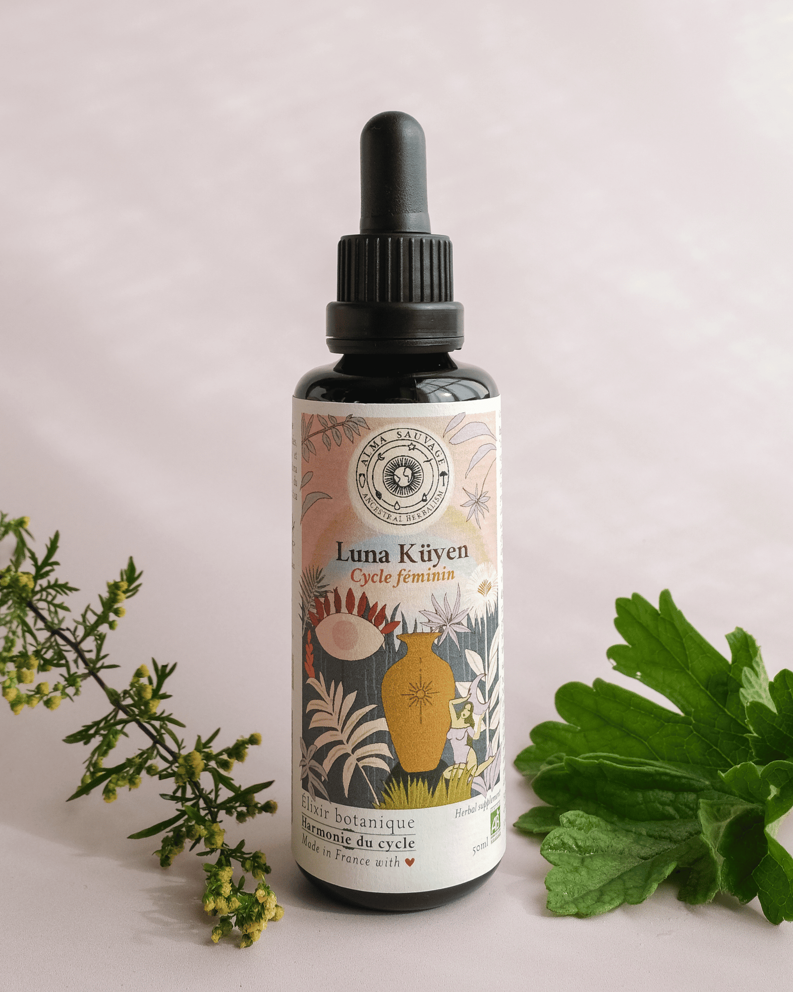 Les 7 plantes de Lune Küyen ont été cultivées, assemblées et transformées au Pays Basque par Marjorie et Alex, duo franco-chilien de paysans-herboristes, à l’aide de techniques ancestrales comme la macération en amphore de terre cuite.