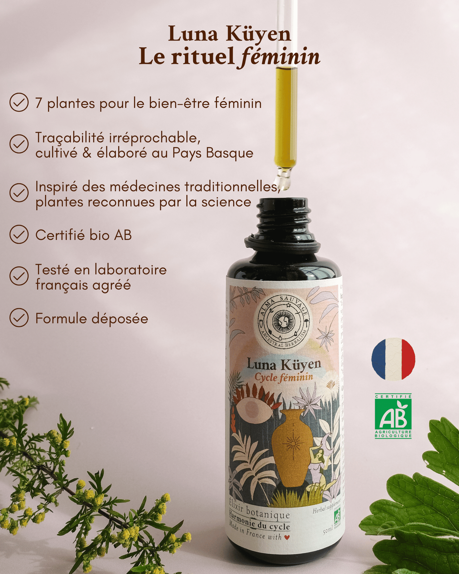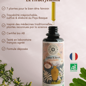 Les 7 plantes de Luna Küyen ont été cultivées par Marjorie et Alex, duo franco-chilien de paysans-herboristes, dans les montagnes du Pays Basque, sur sol vivant, de manière entièrement naturelle, en agriculture biologique. Une fois récoltées, elles ont été mises à macérer ensemble en amphore de terre cuite. Ce procédé ancestral permet d’extraire leurs principes actifs en synergie, décuplant ainsi leurs bienfaits.