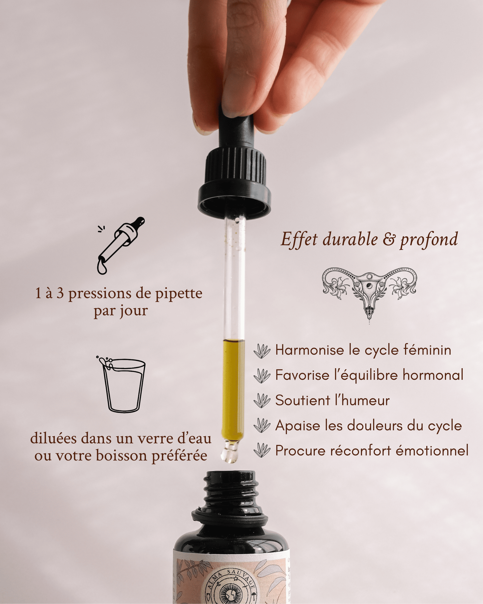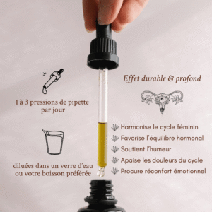 Conseils d’utilisation : Prendre 30 gouttes (l’équivalent d’une pression de pipette) 1 à 3 fois par jour selon le besoin, tout au long du cycle, de préférence en dehors des repas, diluées dans un verre d’eau ou votre boisson préférée.