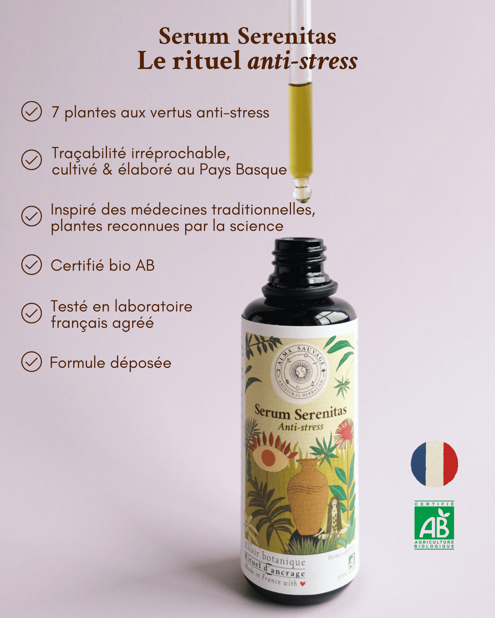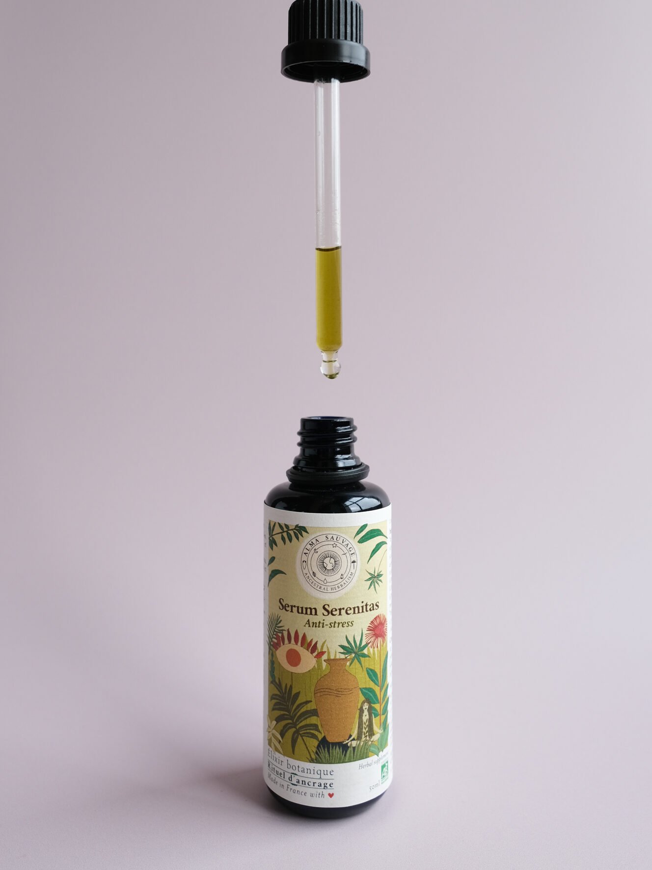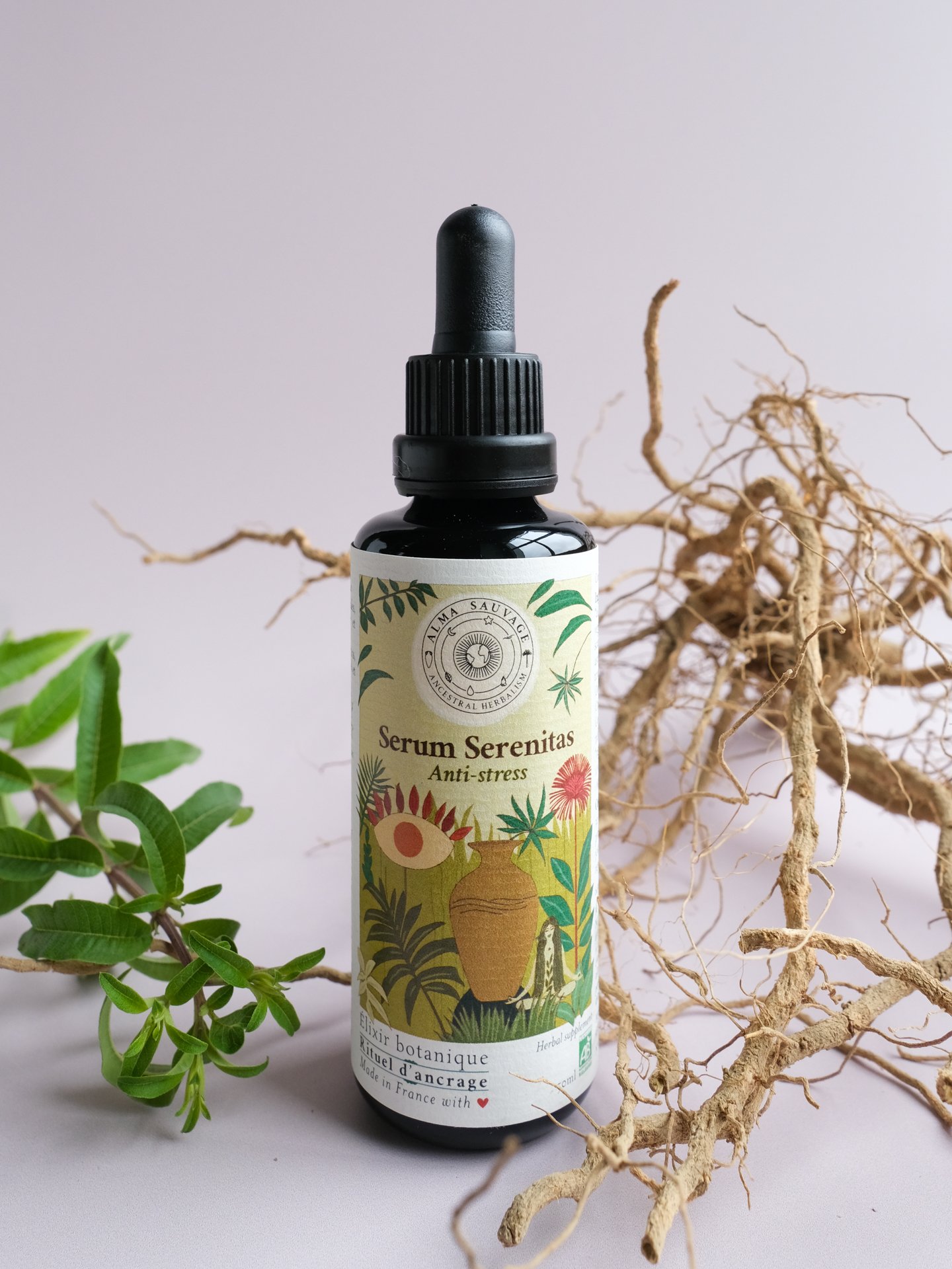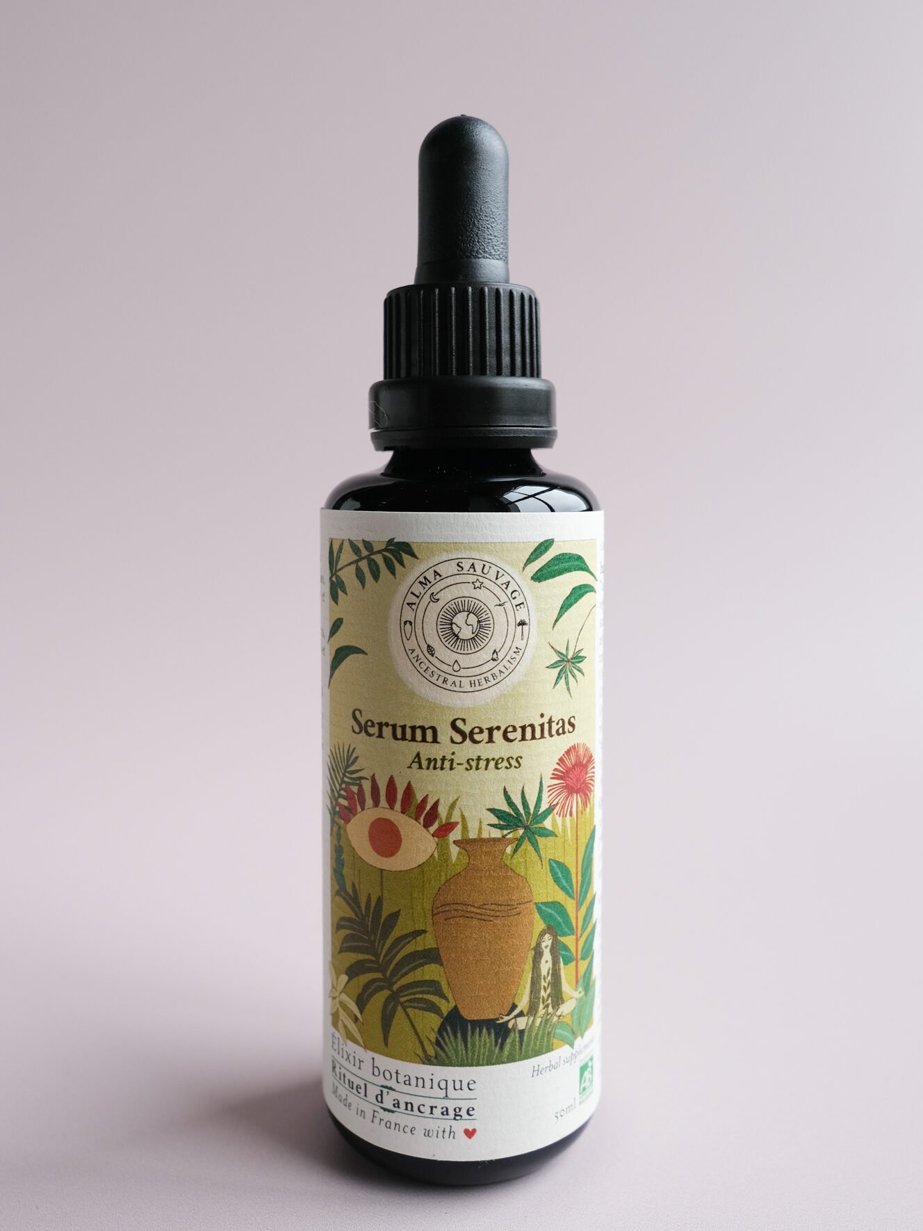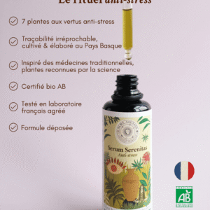 Les 7 plantes de Serum Serenitas ont été cultivées par Marjorie et Alex, duo franco-chilien de paysans-herboristes, dans les montagnes du Pays Basque. Elles sont mises à macérer ensemble pendant un cycle lunaire complet dans des amphores en terre cuite. Ce savoir-faire ancestral permet d’extraire harmonieusement leurs principes actifs, tout en renforçant leur synergie.