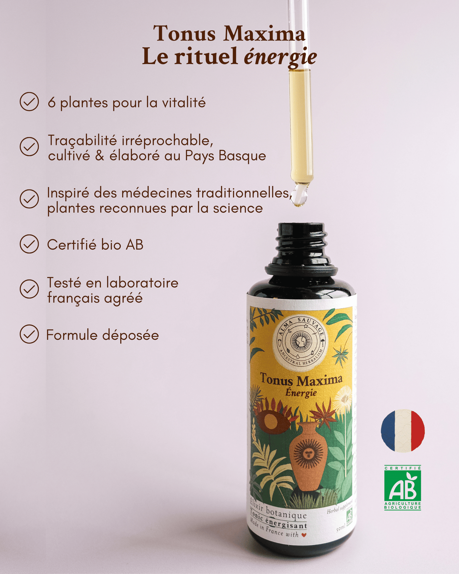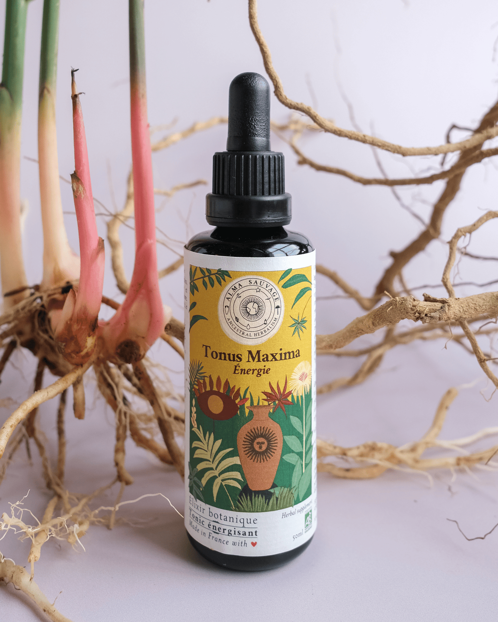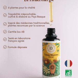 Les 6 plantes de Tonus Maxima ont été cultivées par Marjorie et Alex, duo franco-chilien de paysans-herboristes, dans les terres du Pays Basque, sur sol vivant, de manière entièrement naturelle, en agriculture biologique. Une fois récoltées, elles ont été mises à macérer ensemble en amphore de terre cuite. Ce procédé ancestral permet d’extraire et de concentrer les principes actifs en synergie, décuplant ainsi leurs bienfaits.